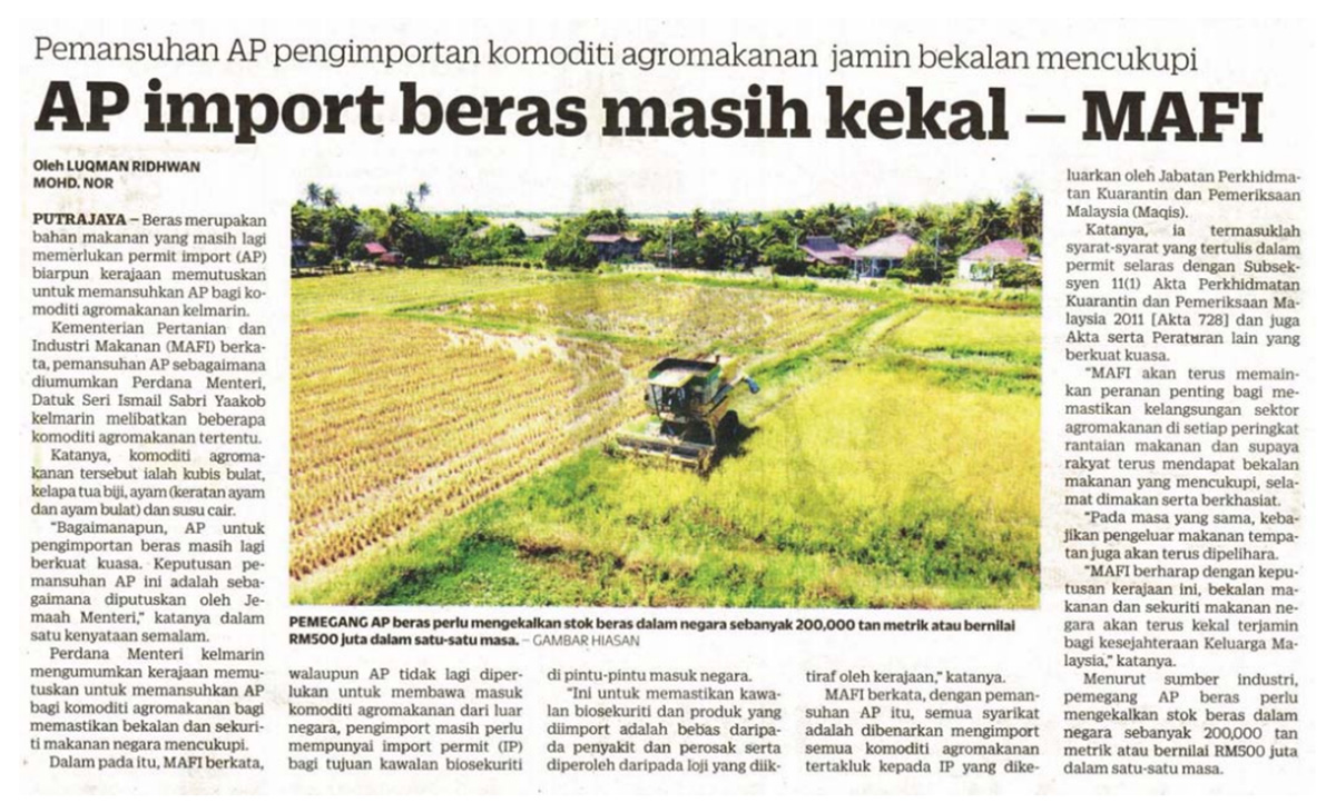 - Bernama: AP untuk komoditi agromakanan tertentu mansuh, masih kuatkuasa bagi beras