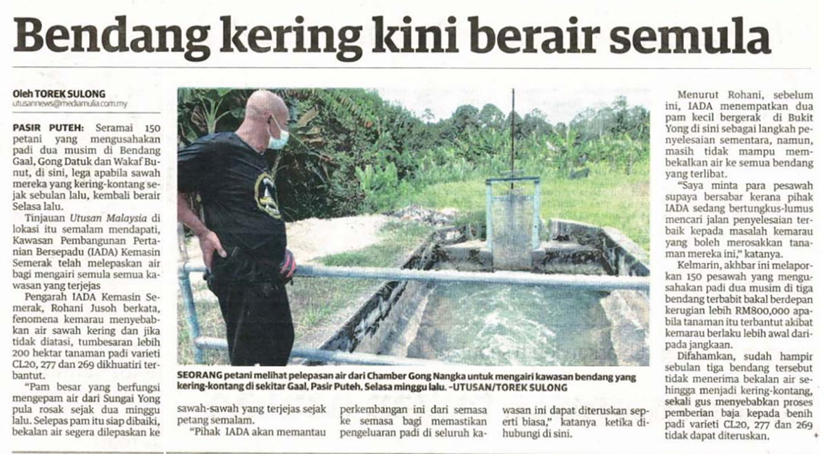 Pengarah IADA Kemasin Semerak, Rohani Jusoh berkata, fenomena kemarau menyebabkan air sawah kering dan jika tidak diatasi, tumbesaran lebih 200 hektar tanaman padi varieti CL20, 277 dan 269 dikhuatiri terbantut.